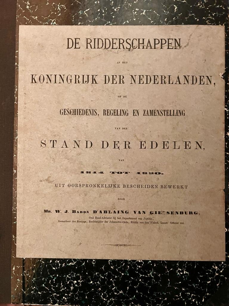 Ablaing van Giessenburg,W.J.baron d'.. - De Ridderschappen in het Koninkrijk der Nederlanden of de Geschiedenis, Regeling en Zamenstelling van den Stand der Edelen van 1814 tot 1850 uit oorspronkelijke bescheiden bewerkt, Gravenhage, C. van Doorn & Zn. 1875, 280 pp.