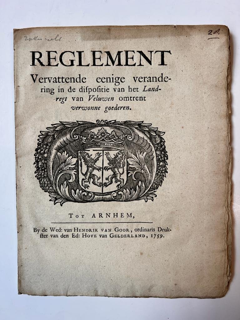 Brantsen, H. W., signatory. - [Pamphlet, Veluwe, Gelderland, 1759] Goederenrecht: Reglement vervattende eenige verandering in de dispositie van het Landregt van Veluwen omtrent verwonne goederen, by de Wed. van H. van Goor, tot Arnhem, 1759, Gelderland, 40 pp.