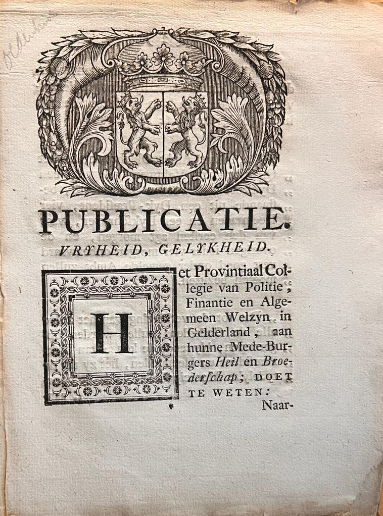 Engelen, Hend., signatory. - [Pamphlet, Gelderland 1797] Publicatie. Vryheid, gelykheid. Het provintiaal collegie van politie, finantie en algemeen welzyn in Gelderland ... doet te weten ... dat in het ambt Oldebroek ... een dykstoel zal worden geformeerd. Het derde jaar ...