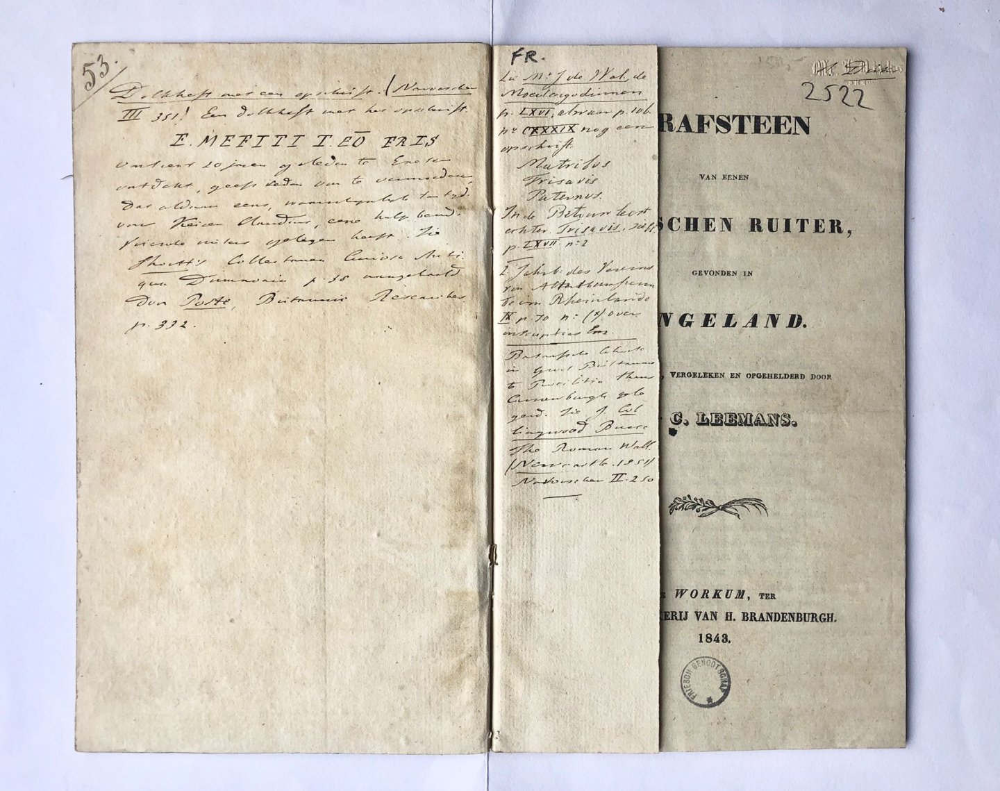 Leemans, C. - [Friesland, Workum] Grafsteen van eenen Frieschen ruiter, gevonden in Engeland. Boekdrukkerij van H. Brandenburgh, Te Workum, 1843, 20 pp.
