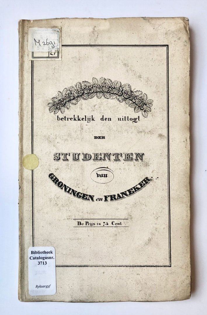 | Titel: | [Friesland, 1831] Gedenkboek, of verzameling van stukken betrekkelijk den uittogt der Studenten van Groningen en Franeker, ten strijde voor het Vaderland in het jaar 1830, J. Oomkens, Groningen, 1831, Friesland, 80 pp. |