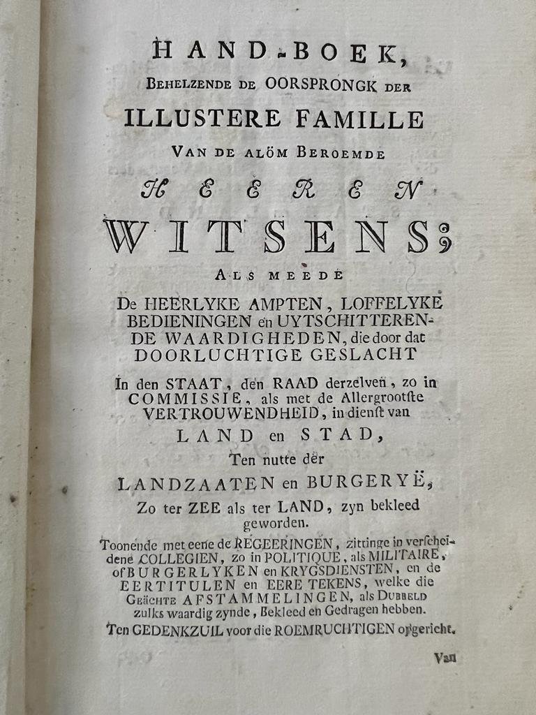 [Bol, Pieter] - Geneology first edition 1774 I Hand-boek, behelzende de oorsprongk der illustere famille van de alom beroemde heeren Witsens (Witsen), [Amsterdam 1774], 60 pp.
