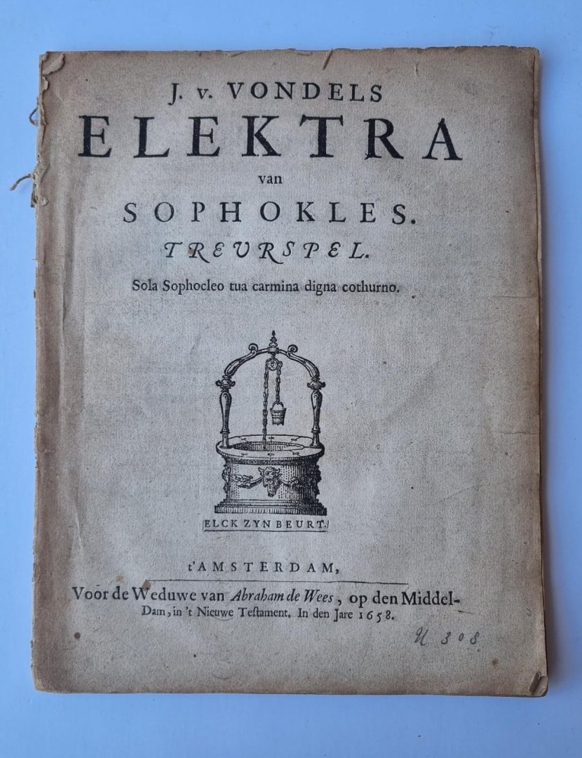 Sophocles; Vondel, Joost van den (trans.) - Classic literature 1658 I Elektra van Sophokles. Treurspel. Sola Sophocles tua carmina digna cothurno. Amsterdam, widow of Abraham de Wees, 1658, 53+[3] pp.
